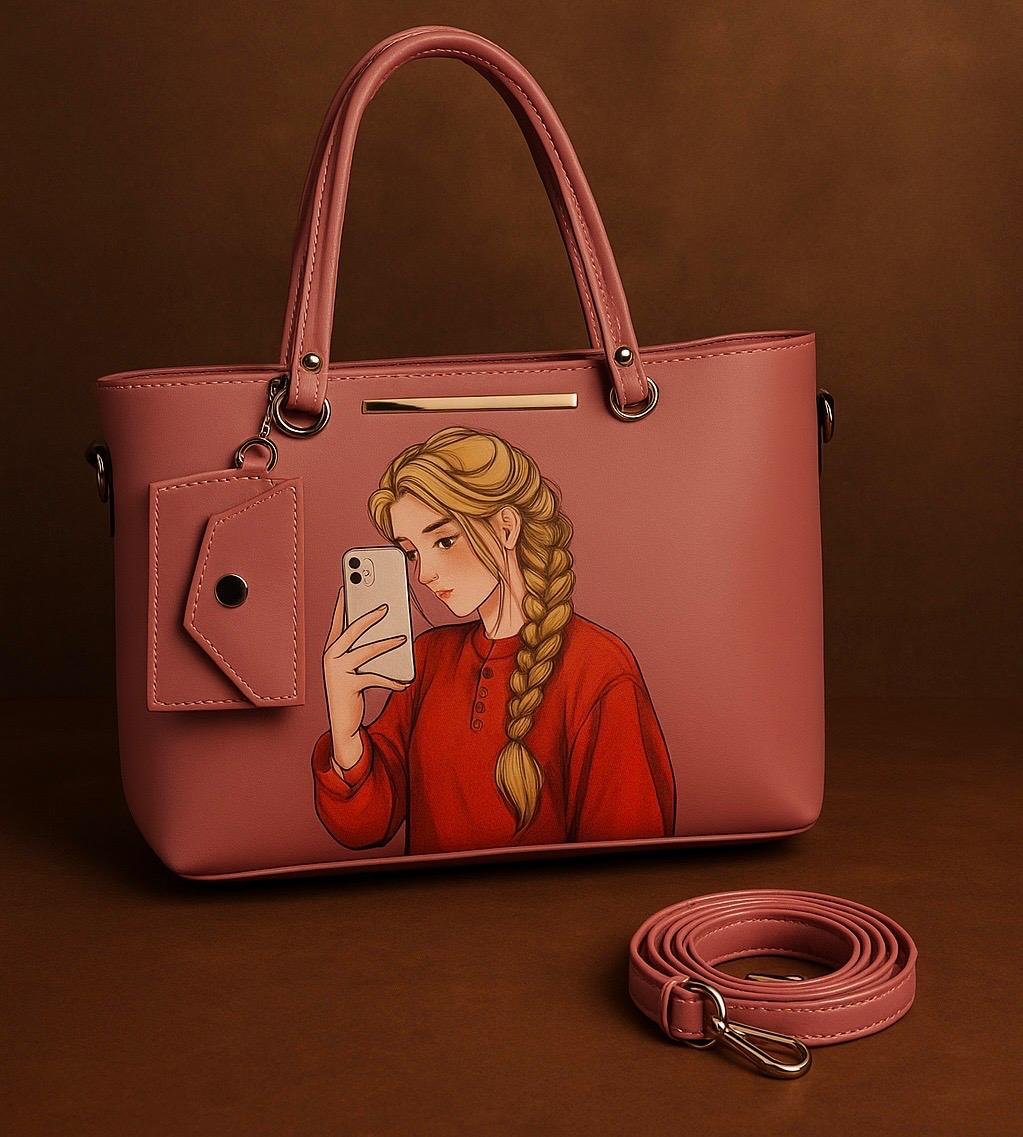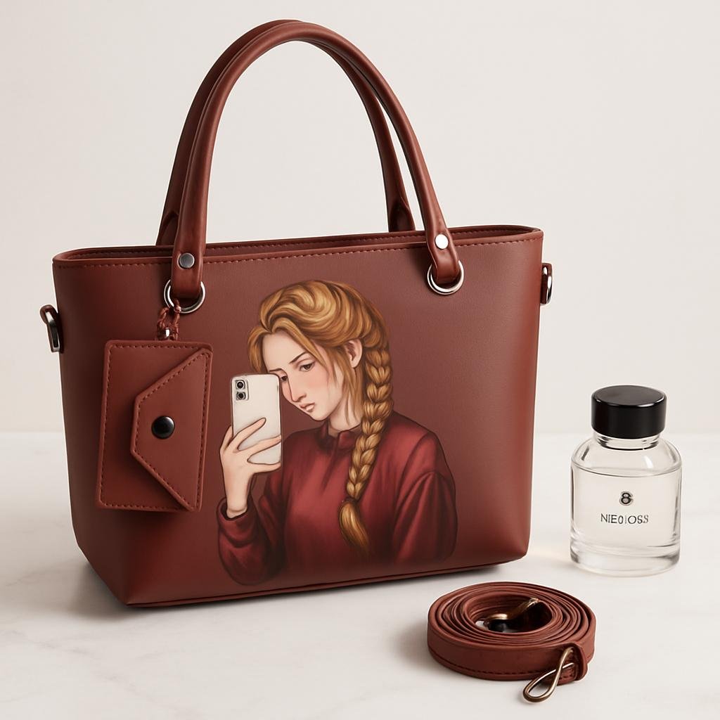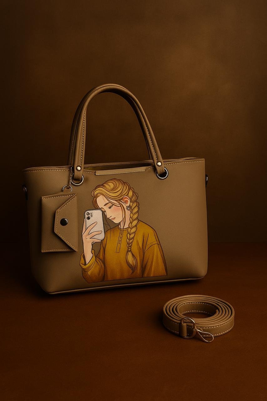 This stylish Tote bag is the perfect blend of modern art and utility. Featuring a unique selfie girl illustration on premium brown leather texture, this bag is designed for bold women who love expressing their personality through fashion.